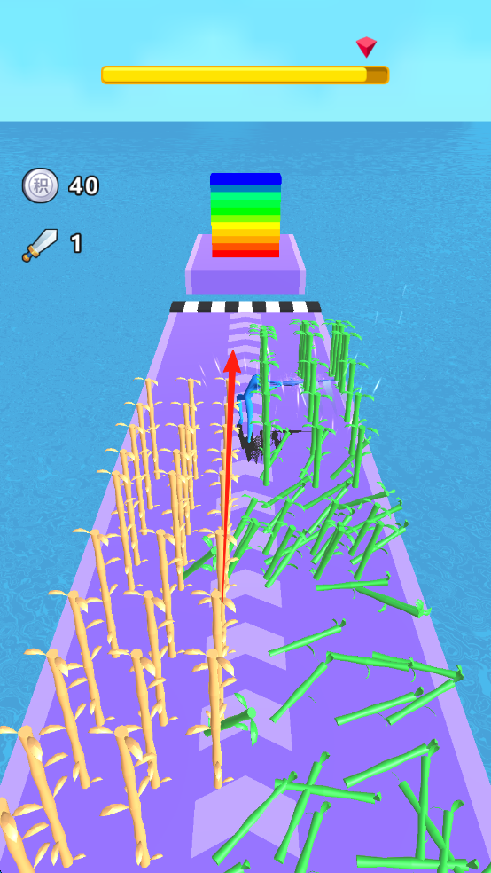 3、突破竹子,甘蔗障碍(箭头),冲向彩虹终点,完成关卡,提升分数。