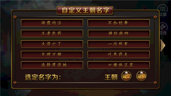 1、王朝自定义体验:可自主设定王朝名字与小目标,从国号到发展方向全权掌控,打造独一无二的帝王基业,感受君临天下的开创乐趣。