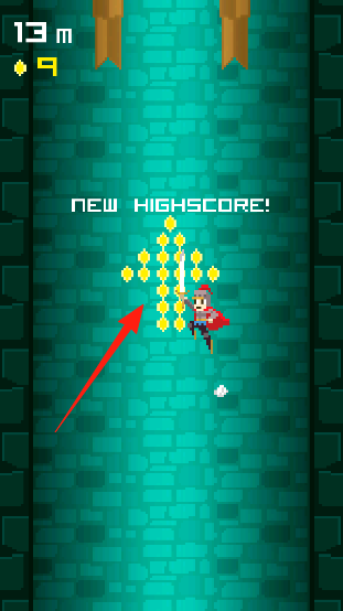 2、跑酷中,沿红箭头方向,收集黄色金币(newhighscore界面),避开障碍,提升距离(如50m)。