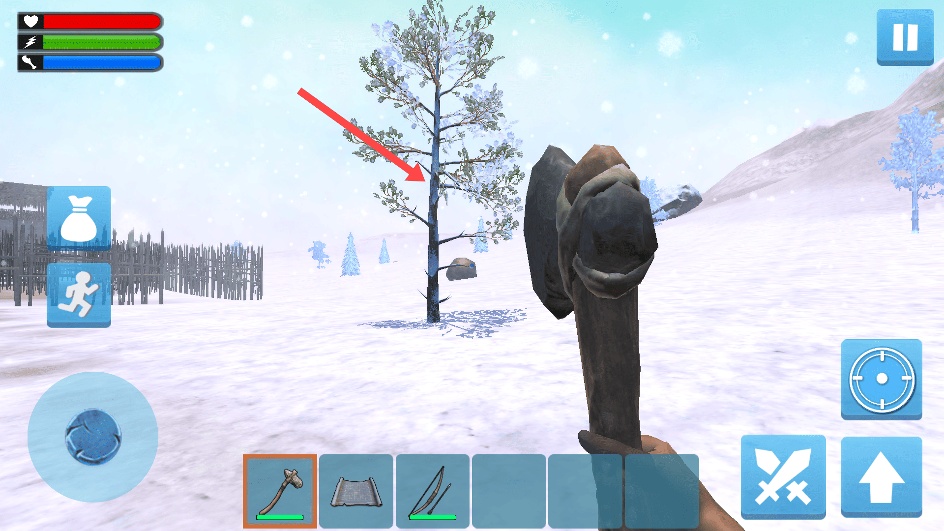 2、操控角色,靠近树木(红箭头),用斧头砍伐,收集资源。