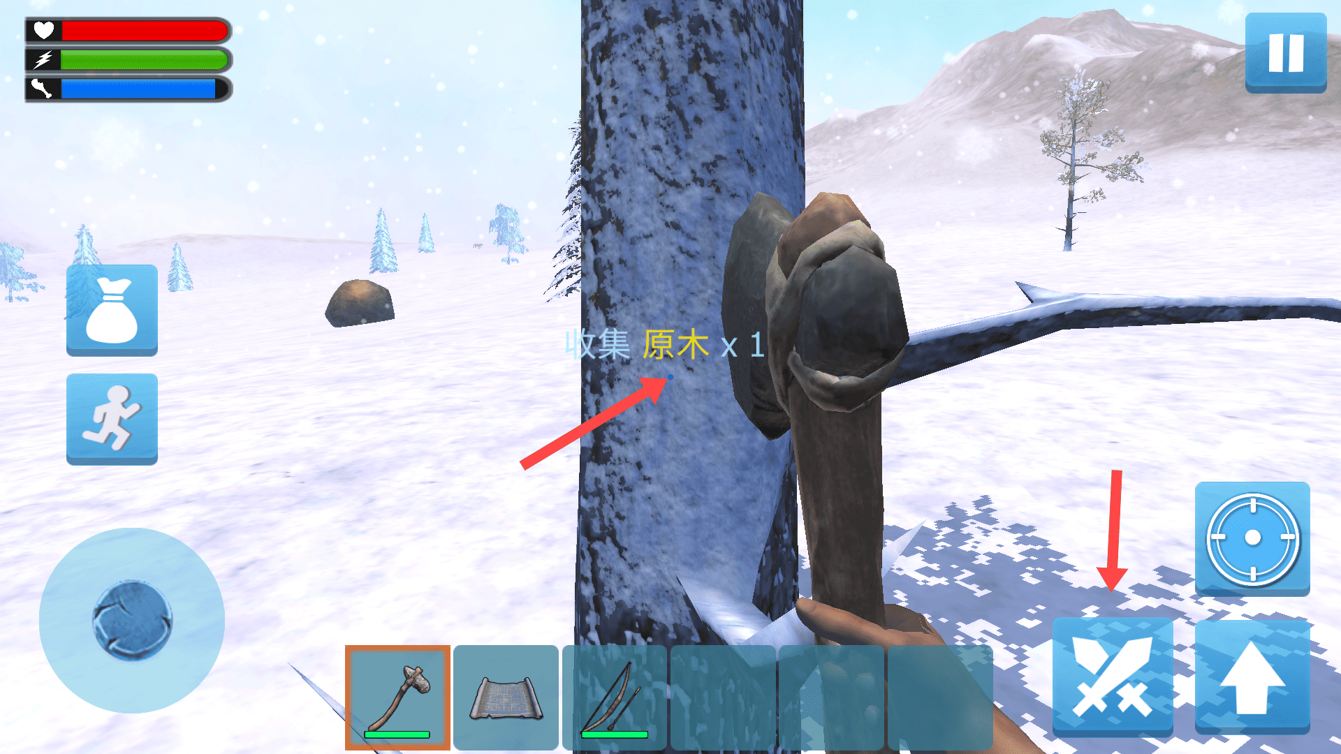 3、砍树后,出现“收集原木×1”提示,点击右侧攻击键(红箭头),继续伐木或防御,积累物资。