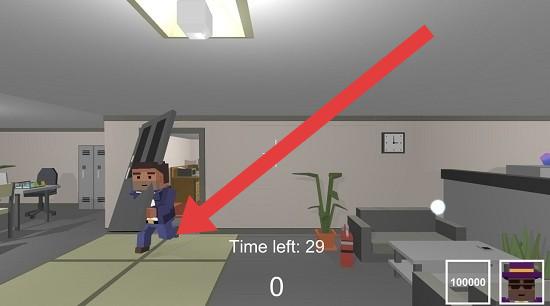 2、进入办公室,留意“Timeleft:29”时间限制,快速和NPC互动接任务,利用场景道具(沙发、绿植)藏身处或找线索。