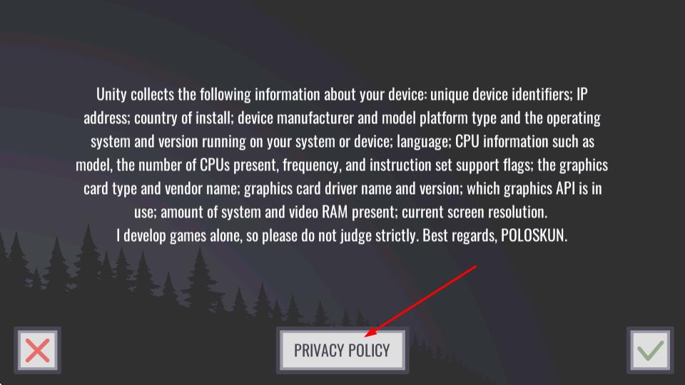 1、启动游戏进入主界面后,点击【PRIVACY POLICY】按钮进入角色创建界面,自定义幸存者外观与初始武器,确认后踏入危机四伏的废土世界。