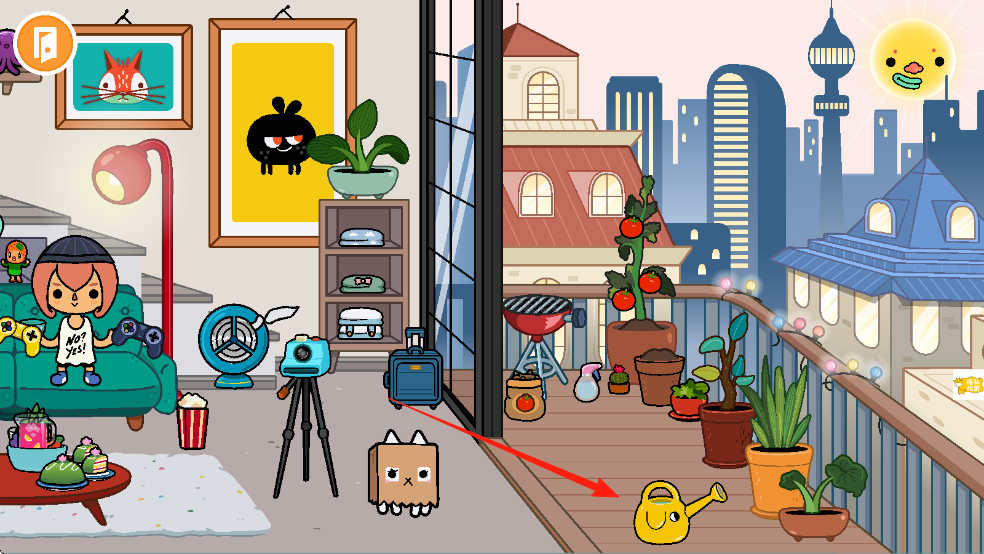 2、滑动到阳台,点击黄色浇水壶,给盆栽浇水,触发植物生长/动画。