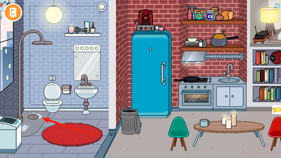 3、进入厨卫区,点击卫生间地漏,触发水流效果,或在厨房操作厨具,制作食物。