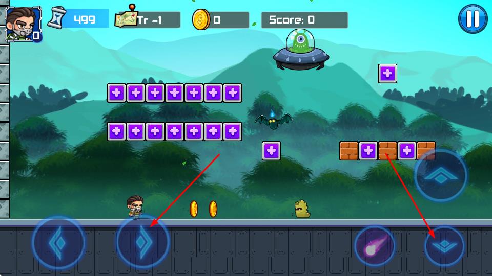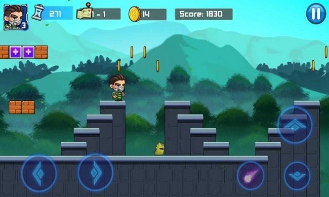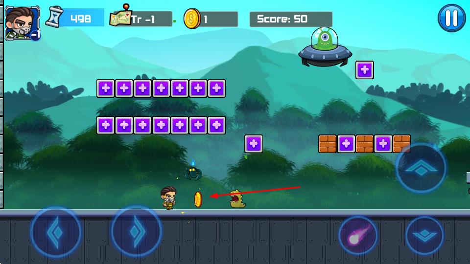 2、在丛林地图界面,滑动屏幕浏览各关卡图标,点击亮起的【关卡1-1】进入场景,通过左右按键控制角色移动,点击跳跃键跨过沟壑或踩击敌人。
