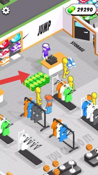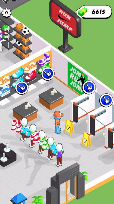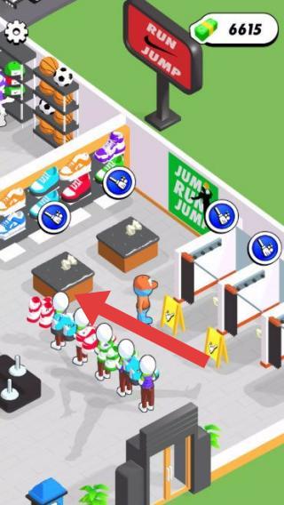 1、玩家在经营商场,图里呈现了商场内的场景,有排队的顾客、商品陈列区(如鞋类货架)等,需通过合理运营(如引导顾客、管理商品等)提升商场效益。