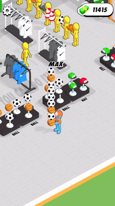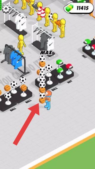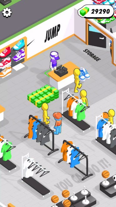 2、画面中有耐克(NIKE)等品牌服饰、球类(BALL)等商品陈列,还有顾客和员工角色,玩家需经营商场,通过合理布局、服务顾客等提升效益。