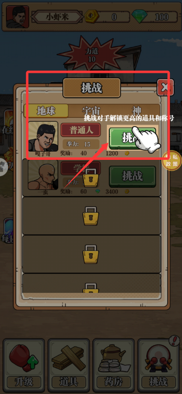 2、选择挑战对手,可解锁新装备,提升角色等级获取稀有称号。