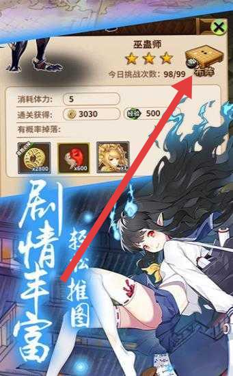 3、挑战“巫蛊师”时,点击箭头指向的“布阵”,调整出战式神阵容,消耗体力,参与战斗,获取奖励。