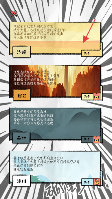 2、在冒险模式列表中,选择已解锁关卡(如沙漠关卡),依据背景剧情(躲避边巡队、潜入堡垒)开启挑战。