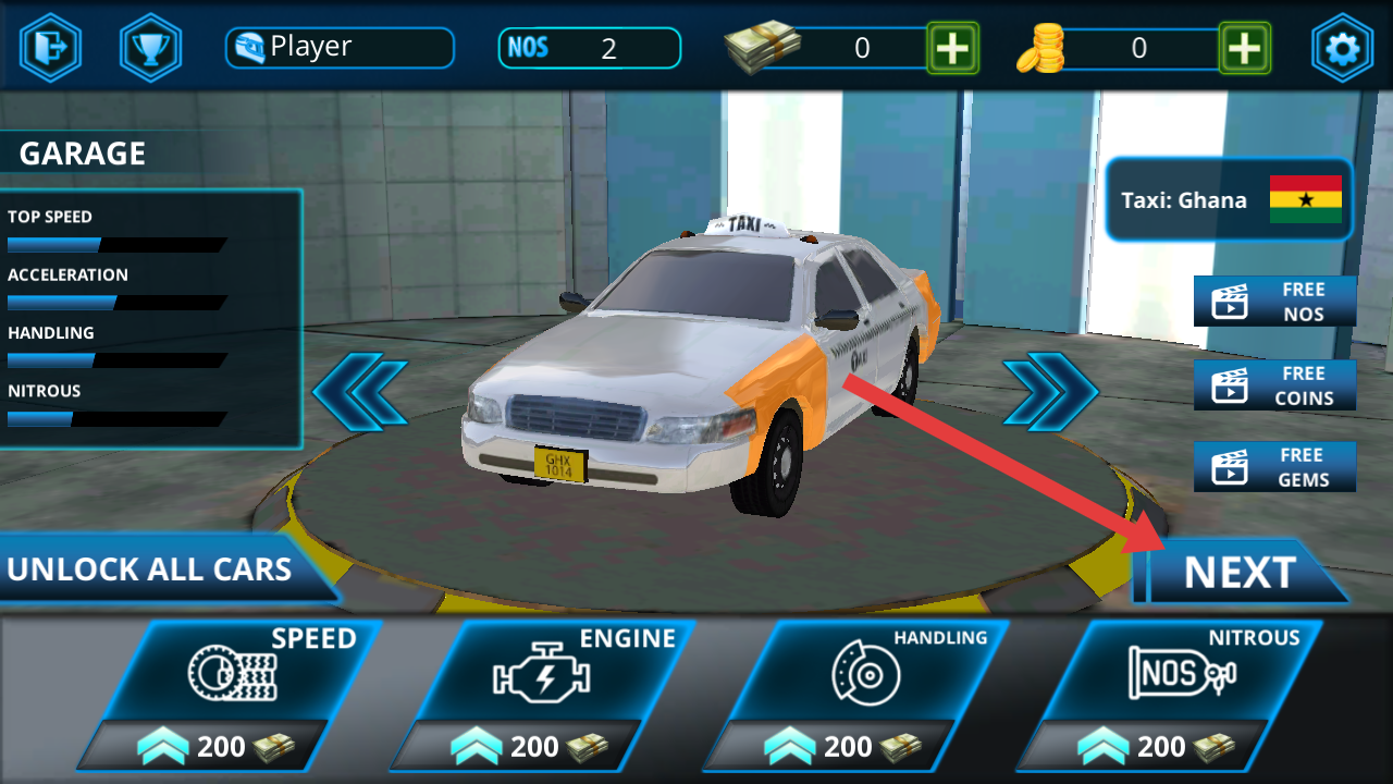 2、在车库界面中,点击【NEXT】按钮,可浏览车辆信息或切换赛车,推进游戏进程。