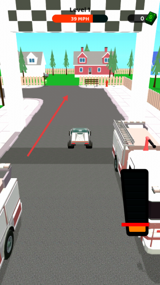 3、过路口、躲消防车,保持39MPH左右,冲过终点(黑白格旗),完成竞速。