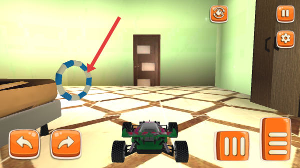 2、操控者操控赛车时,需要优先驶向场景中的蓝白圆环道具,收集该道具以推进游戏进程。