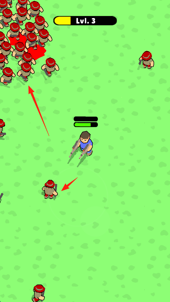 2、Lvl.3时,切换双枪,分散攻击(箭头分路),避免被围,保存血量(绿条)。