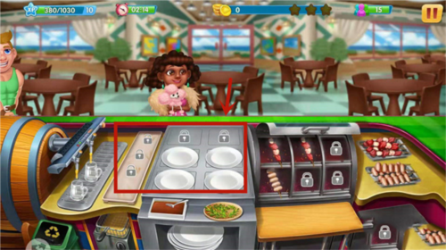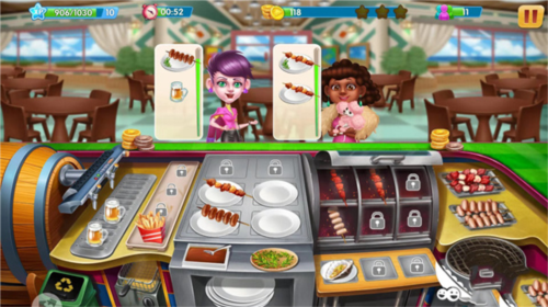 2、应对顾客(第二张),记清不同角色餐品(烤肉、薯条),优先做需求多的,上菜后及时收钱升级。