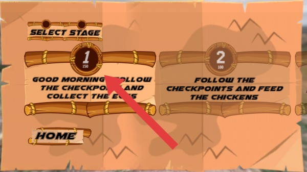 2、这是养鸡场村庄的关卡选择界面,有第1关即跟随检查点收集鸡蛋、第2关即跟随检查点喂鸡,可选择关卡开始养鸡场经营任务。
