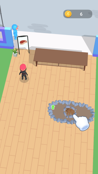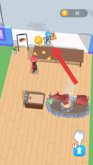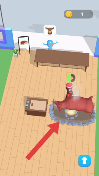 3、玩家经营餐厅,图中显示金币、角色、烤肉设施、顾客用餐及金币收益等元素,需完成烹饪、服务顾客、收获金币等操作,体验餐厅经营流程。