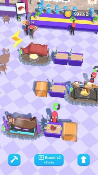 2、玩家经营餐厅,图中有金币、顾客、烤肉烹饪场景等元素,需完成烤肉制作、服务顾客等操作,体验餐厅经营流程,属于模拟经营玩法。