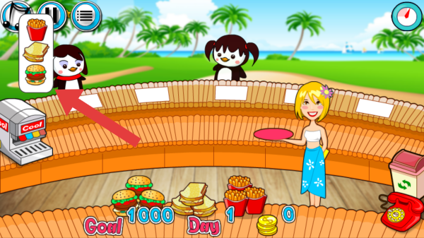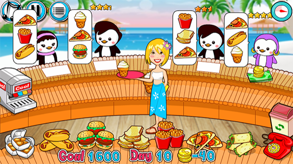 2、画面呈现餐厅经营场景,有企鹅顾客、服务员,显示Day1等,玩家需为企鹅顾客提供对应食,完成经营目标,体验餐厅服务与管理流程。