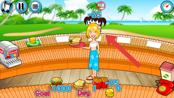 3、画面呈现餐厅经营场景,有服务员、食物,还有金币、数值变化(-25)等,玩家需为顾客提供餐食,完成经营目标,体验餐厅服务流程。