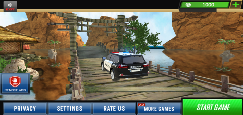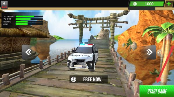 1、进入游戏的主界面后,点击界面右下角绿色【STARTGAME】的按钮,驾驶警车开启特技冒险之旅。