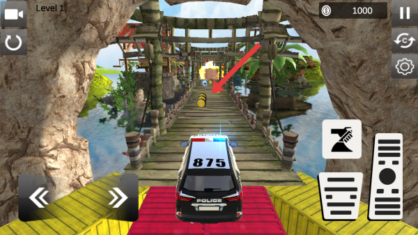 3、在特技卡车模拟驾驶Level1中,操控警车沿木桥行驶,收集箭头指向的金币,向目标区域推进。