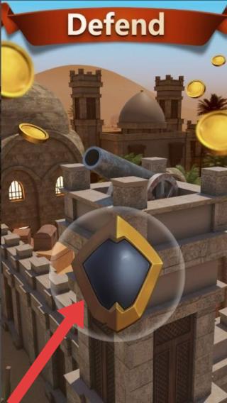 2、画面中有城堡、炮台、金币、盾牌状建筑升级/互动标识等元素,风格偏向古文明(如中东建筑风格)的塔防。