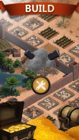 1、画面中有建筑场景、工具图标(扳手图案)、金币宝箱、木桶等元素,呈现出模拟经营建造的风格,从画面看是主打沙漠或古文明背景的建造模拟。