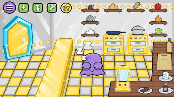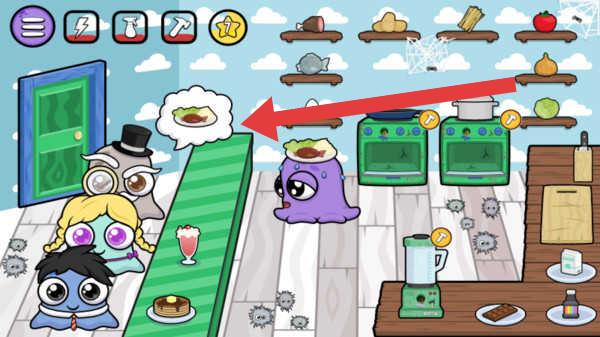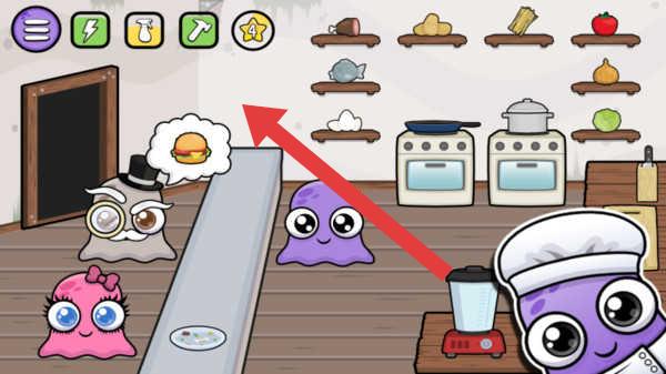 1、普通场景关卡,观察戴礼帽怪物的菜品需求(思维泡泡显示),从货架取食材,用炉灶烹饪对应食物,满足订单。