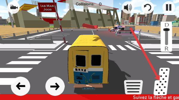 2、在塞内加尔汽车驾驶模拟的驾驶界面中,点击右侧带黑点的按键控制油门,驱动黄色巴士启动前行。