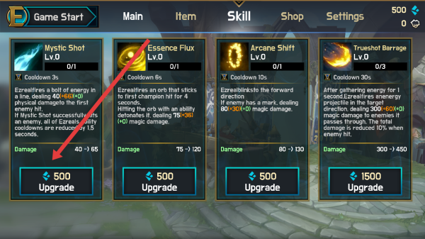 2、切换到技能(Skill)页,点击“Mystic=Shot”的【Upgrade】,消耗500资源升级技能,提升伤害(40→65)。
