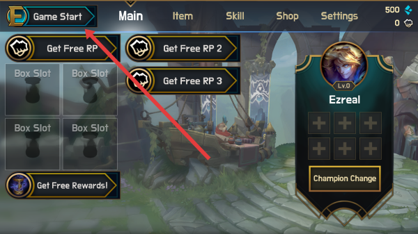 3、回到主(Main)界面,点击【Game-Start】,进入游戏对战,用强化后的装备与技能,操控伊泽瑞尔战斗。