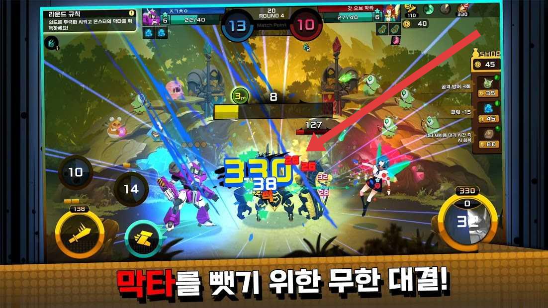 1、战斗场景,聚焦箭头指向的敌方怪物,释放技能(对应技能按钮),利用属性克制,打出高额伤害(如“330”数值)。