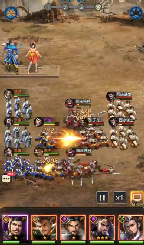 1、基础战斗流程:采用即时策略模式,底部武将卡牌操控上阵角色。技能释放附带数值伤害,兼具单群体效果,自动战斗与四倍速功能优化操作与节奏。