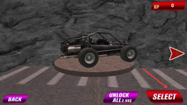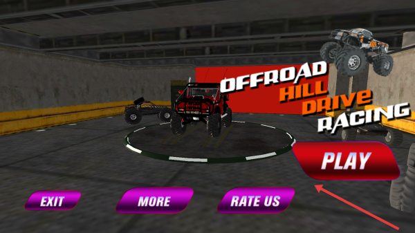 1、点击【PLAY】,进入《OffroadHillDriveRacing》(越野山地驾驶赛车),选黑色越野车(点【SELECT】)。