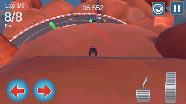 3、避对手车,冲过弯道、坡道,完成3圈(Lap1/3),争取“Pos1”,赢金币解锁新车。