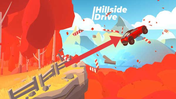 1、开启【HillsideDrive】,操控红色赛车飞跃悬崖,避障碍,利用地形加速,体验山地特技驾驶。