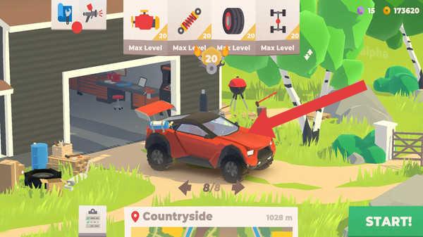 2、在车库,升级车辆部件(如轮胎),选【Countryside】场景,点【START!】开始乡村赛道挑战。