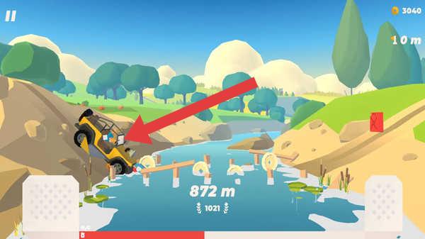 3、驾驶黄色越野车,过河流木桥,控方向避落水,借地形(山坡、弯道)调整车速,推进872m赛程。