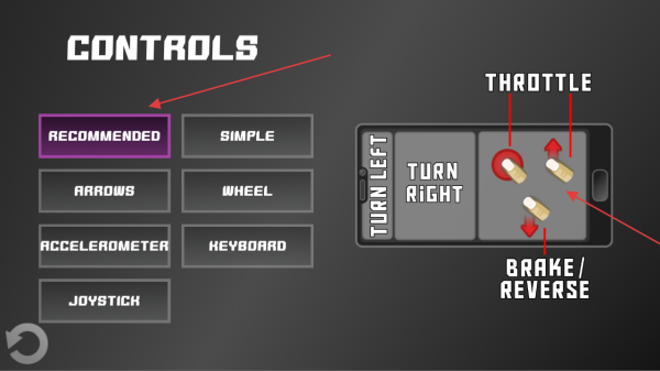 2、进入【CONTROLS】界面,选推荐操控模式,熟悉【THROTTLE】【BRAKE/REVERSE】等按键功能。