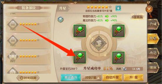 2、打开升星页,放装备与升星石,选择升星方式,提升装备星级加防御。
