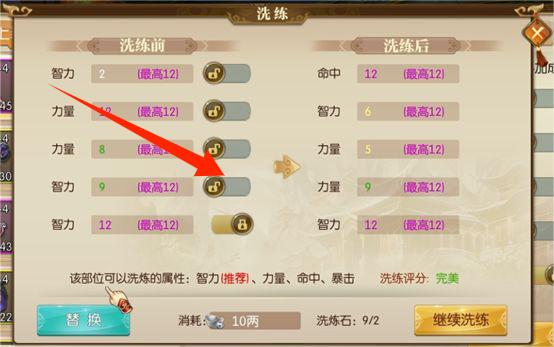 3、在洗练界面,消耗洗练石,调整装备属性,替换优质属性优化战力。