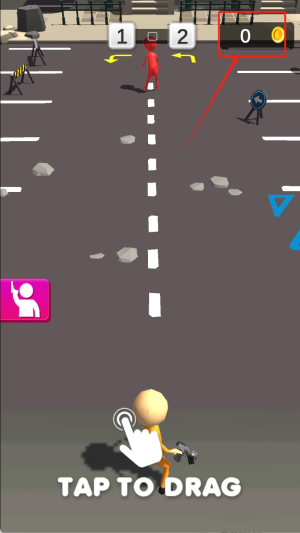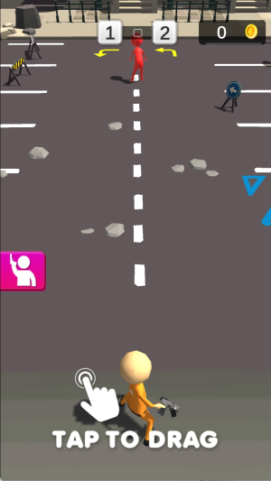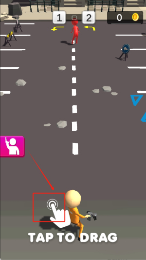 1、点击屏幕下方"TAP TO DRAG"提示区域,拖动黄发小人沿道路箭头方向移动,注意避开上方红衣角色。