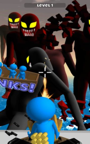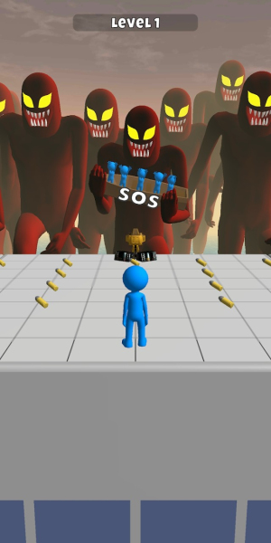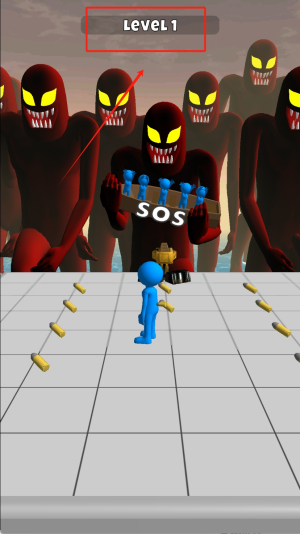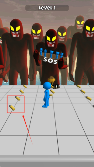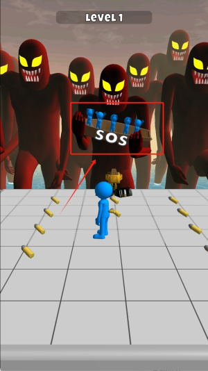 2、在LEVEL1场景中注意红框标记的SOS木板,利用其作为掩体躲避红巨人追击,同时收集木板上的蓝色道具。