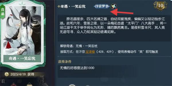 1、奇遇解锁前置:查看逆水寒“奇遇·一笑忘忧”卡片,明确需将无情好感度提升至1000。