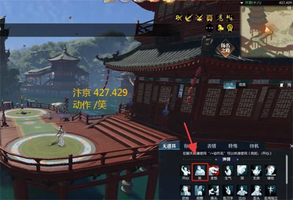 2、场景动作触发:前往汴京地图的王黼宅(坐标428,429),在角色交互界面选择“笑”表情动作,触发该奇遇。