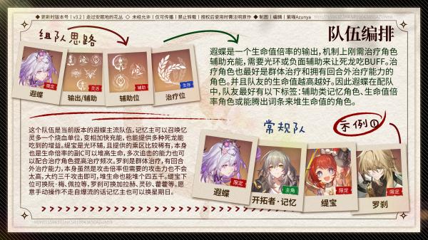 1、常规队:遐蝶+开拓者・记忆+缇宝+罗刹,忆灵加速充能,缇宝堆生命增乘区,罗刹群体治疗,适配高配置,提升输出与治疗联动。