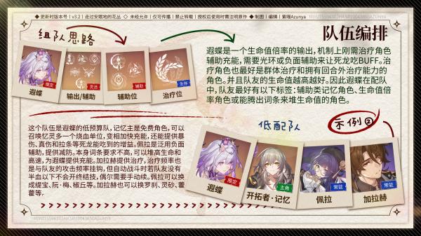 2、低配队:遐蝶+开拓者・记忆+佩拉+加拉赫,免费忆主增伤拉条,佩拉减防辅充能,加拉赫治疗,低养成成本,手动补治优化体验。