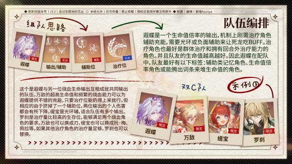 3、双C队:遐蝶+万敌+缇宝+罗刹,万敌高生命烧血充能,缇宝光环辅,罗刹高治疗,双输出互补,治疗充足可换角色。